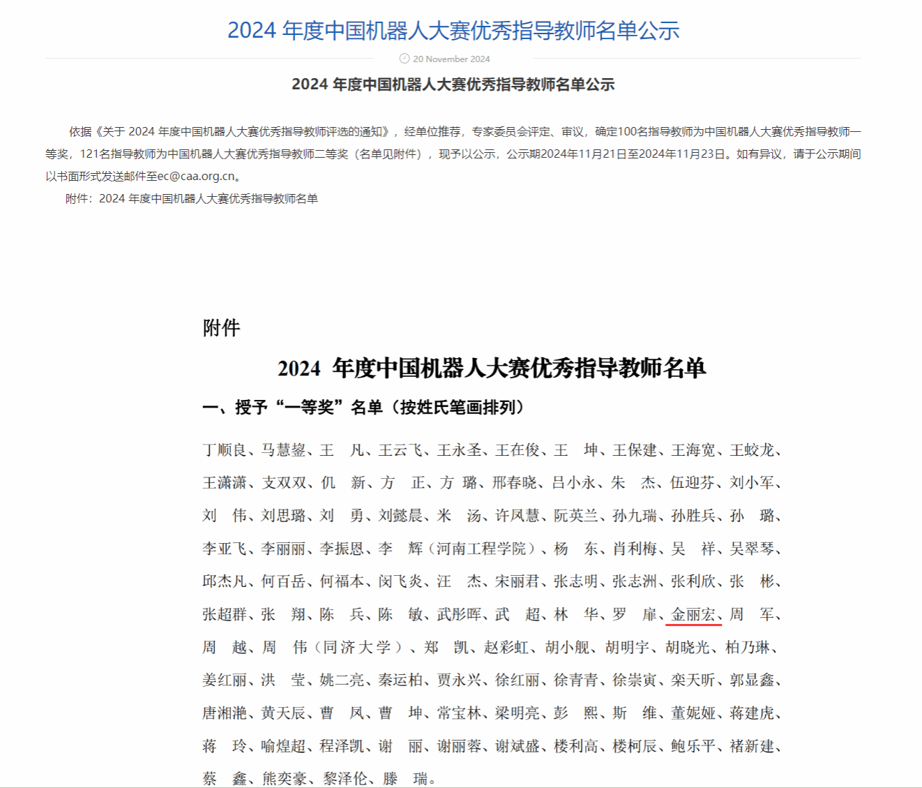 经单位推荐,专家委员会评定、审议,确定100名指导教师为中国机器人大赛优秀指导教师一等奖,121名指导教师为中国机器人大赛优秀指导教师二等奖。