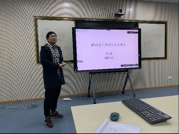 时亚洲副教授做了题为“RNA 空间结构的从头预测”的报告。报告对现有的RNA空间结构的预测方法进行简单的综述,在此基础上,进一步详细介绍提出的粗粒化模型。该模型不仅能够从头预测(即仅基于给定序列)RNA分子的空间结构,还能定量预测温度及离子条件对RNA结构的影响。