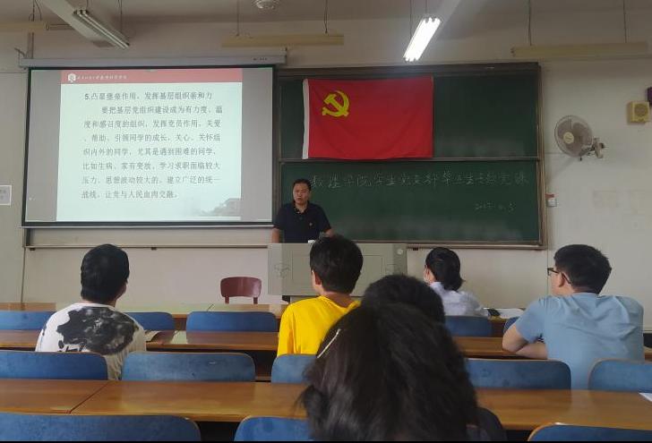 为学习贯彻习近平新时代中国特色社会主义思想,加强毕业生党员的思想政治教育,6月3日上午,数理科学韦德bet 党委副书记陈国鹏在崇志楼215教室为2022届毕业生党员讲授“贯彻新思想,增强战斗力,不断提升高校思想宣传工作能力”专题党课。会议由学生党支部书记方媛主持,全体毕业生党员参加。