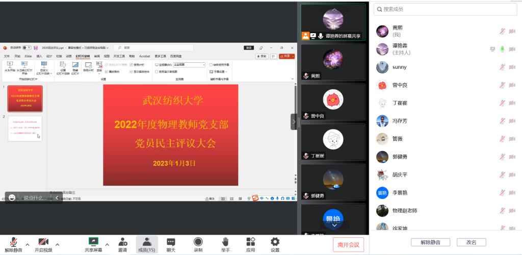 1月3日上午,物理教师党支部通过线上形式召开组织生活会,会上组织进行了民主评议党员工作。党支部书记谭艳蓉主持会议,全体在职党员参加。