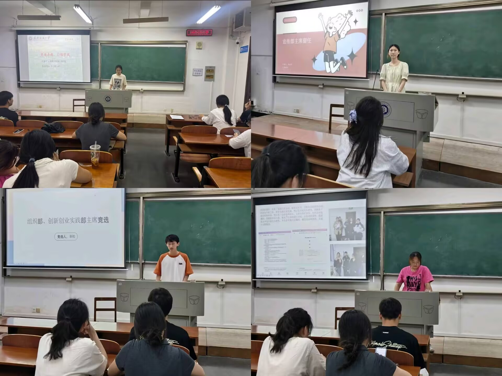 竞选时,曾琦老师向我们大致讲解了主席的一些职责,随后便开始了各个学生答辩展示,在每位竞选的学生讲明了自己的竞争优势后,曾老师以及主席团的成员则会对他们针对性的提问。其中,应数12302班刘欣荷竞选学习部主席;应数12301班竞选宣传部主席;应数12302班章松竞选组织部、创新创业实践部主席;应数12302班黄丹丹竞选劳育、志协主席;信科12302班张雅琼竞选文体活动部主席;应数12301班夏韵竞选宣传部主席;应数12301班张子豪竞选体育部主席;应数12302班卫云倩竞选秘书部主席。