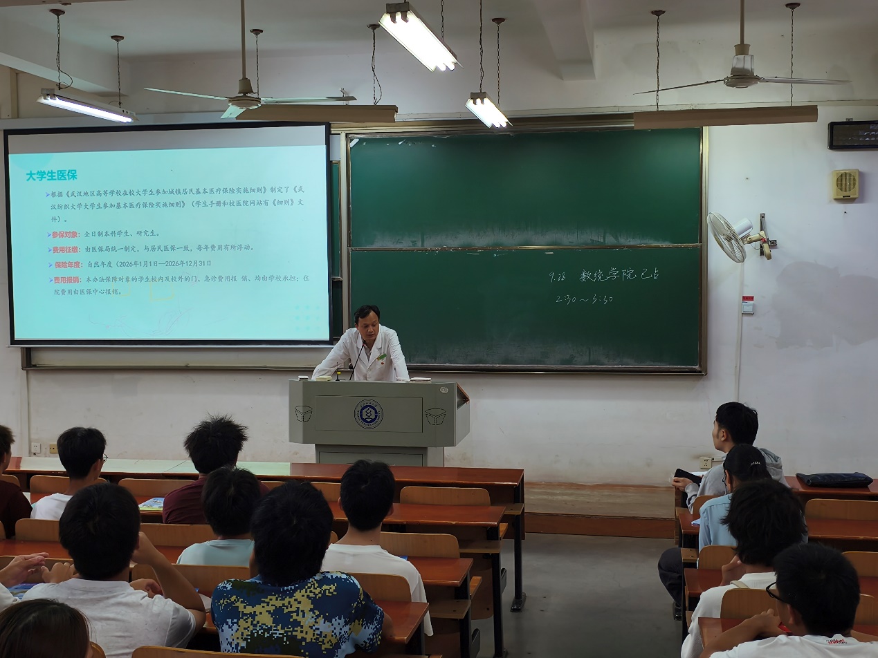 讲座现场,校医院医护人员以专业且通俗易懂的讲解,围绕大学生医保政策和校医院就诊管理两大板块展开。在医保政策解读中,医护人员依据《武汉地区高等学校在校大学生参加城镇居民基本医疗保险实施细则》,明确了参保对象为全体全日制本科生、研究生,介绍了费用征缴、保险年度及报销范围等内容,让新生清晰了解自身医疗保障权益。