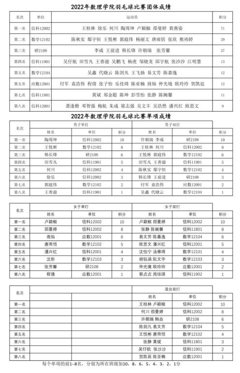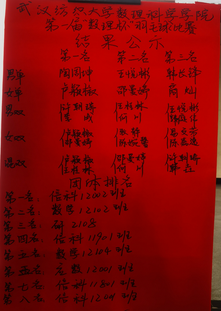 日色渐晚,比赛圆满落下帷幕。通过举办此次比赛,增强了同学们对羽毛球运动的认识,极大的燃起了同学们对体育运动的热情,更展现了数理学子积极向上、努力拼搏、不断进取的精神风貌!