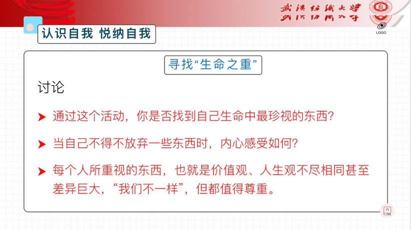 心理育人体系,丰富育人内涵,提高同学们的心理素质水平。爱自己,就是要认识自我,正确评价自我,接纳自我:不仅要去爱、去悦纳自己的优点、长处,还要勇敢接纳自己的缺点和不足,在接受自己不足的基础上,努力改进自己、完善自己。爱他人也是如此——欣赏、学习他人的优点,接纳、包容他人缺点。人首先应自爱,爱自己是爱一切的开始,爱自己才能爱别人,爱集体,爱生活。主题班会进行了寻找“生命之重”讨论活动,呼吁同学们认识自我,悦纳自我。