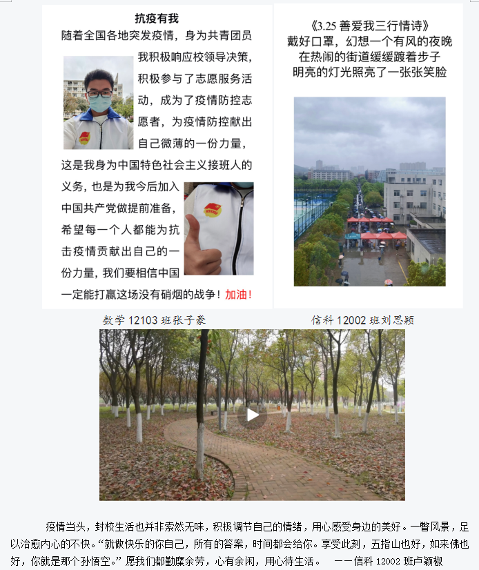“3.25善爱我”作品征集活动分为三个部分:拍摄视频—记录生活的点滴、三行情诗—善爱自我为自己写诗、抗疫照片—同心抗疫分享最美的你。前期依靠班级心理委员和韦德bet