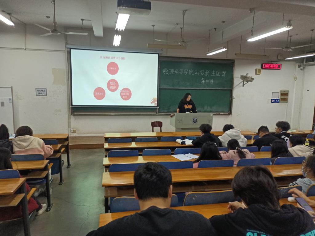 活动伊始,郑思成从当前就业市场及需求为同学们分析了关于数学专业的就业方向以及大学生如何做好自己的职业生涯规划。他强调,在如今大学生人数过度饱和的时代,大学生不再是天之骄子,同学们需要调整好心态,努力钻研,有所特长,乐于奉献,品学兼优的人才更被青睐。预备党员吴菲主要向在场新生介绍了大学期间可以通过努力而争取到的荣誉称号及奖学金类型,讲解了综合测评成绩加分细则及如何进行社团选择,鼓励同学们在校期间积极进取,力争上游。