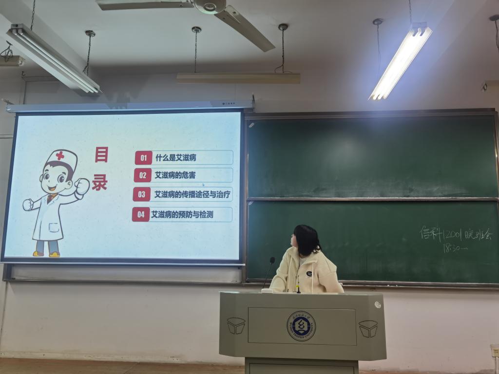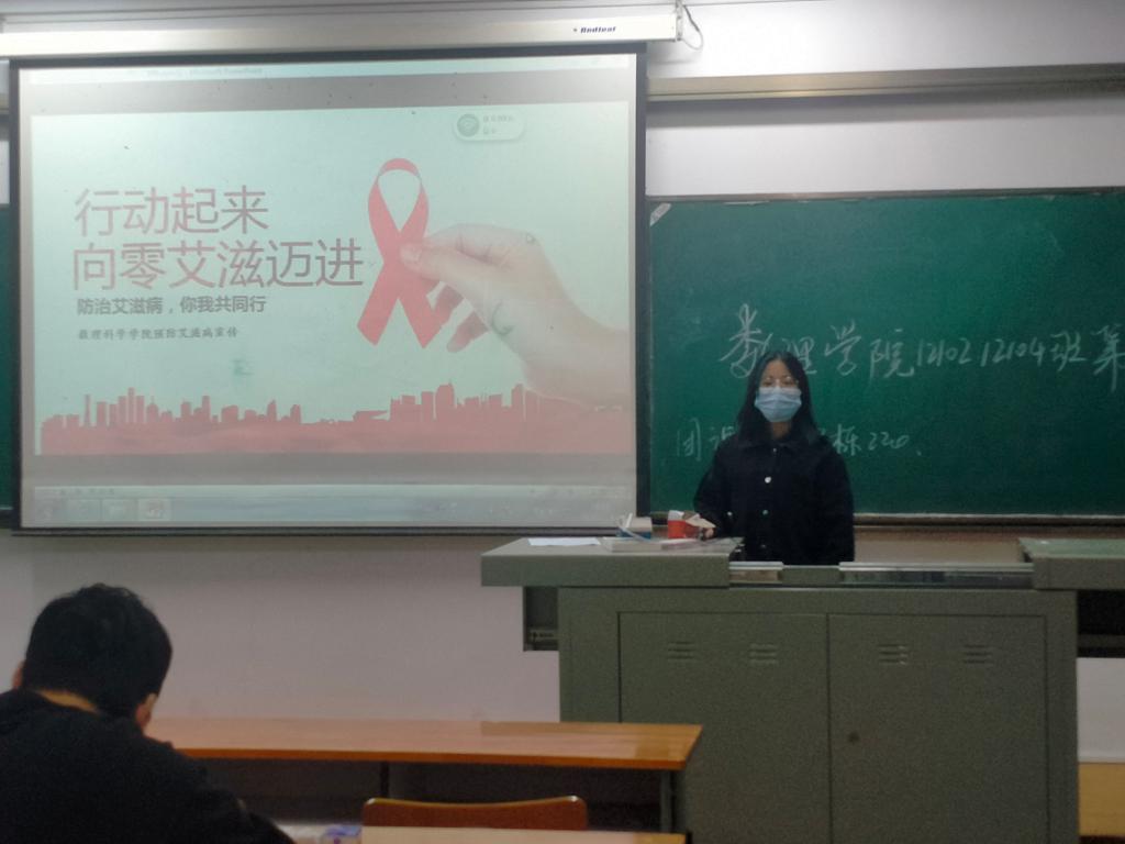 学生易文芳、李慧君、马雪琴三位同学分别于崇志楼、崇文楼在20、21级的班会上组织开展预防艾滋病的宣讲活动。
