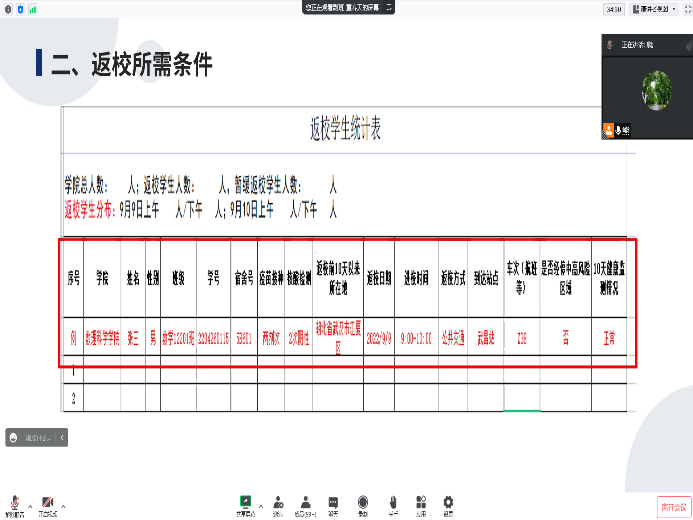 的相关规定;二是要树立防诈骗意识,要防范不法分子的网络诈骗、电信诈骗等。随后从开学时间及返校时间、返校所需材料、新生联络员选聘三个方面出发,并结合具体要求为大家详细解释了在现在的疫情形势下如何安全,稳妥的完成返校,他强调,一是严格遵守疫情防控相关规定,点对点直接返校,不得提前返校,严格执行学校的疫情防控政策,做好健康检测,轨迹跟踪,并对不能返校的情况做了详细解读。二是对返校所需材料及截止时间做了详细要求,要在规定的时间节点完成相应的资料填写任务,并根据疫情具体情况制定不同的返校计划。三是现面向新生选聘联络员,积极调动新生进行自我管理、自主管理。