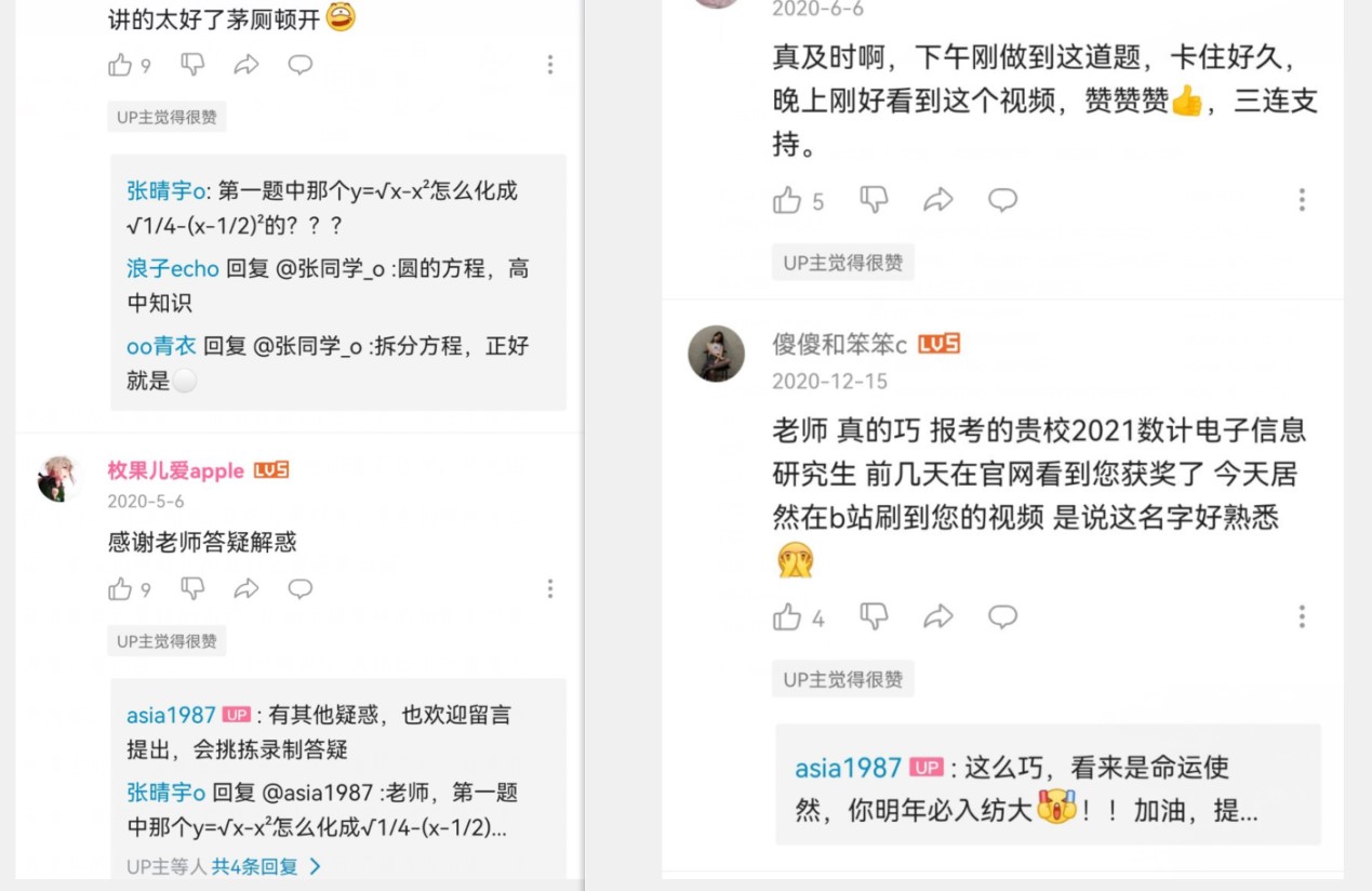 时老师总是“从善如流”,也会向学生们学习怎么做有吸引力的封面、怎么用网络化的表达让课程更活泼。因此吸引了一大批学生来听他的课,但时亚洲老师也有自己坚持的东西,比如不做零碎的知识点内容,每次都是一次讲清楚,哪怕要上一个小时“网课”。“我最愿意做的是学生答疑视频,如果有个知识点很多人不会,那我就拍个视频仔细讲。只要我不停做下去,这些视频就会成为学生的数学资源库,学习中碰到不懂的内容时,就可以直接上B站搜索。”时老师说,“这对师生双方都是减负。”