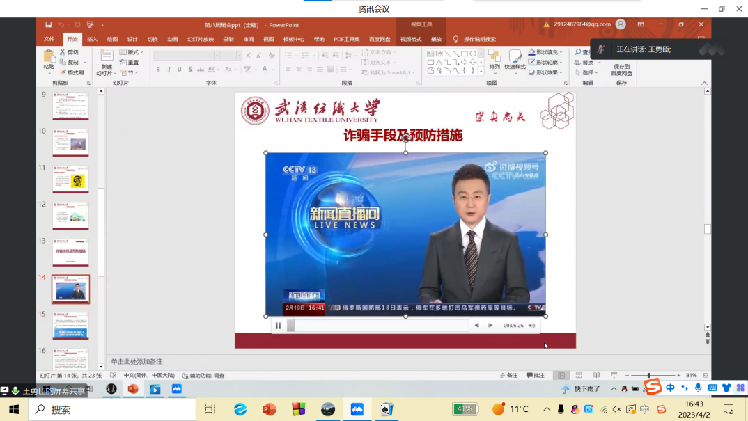 本次会议围绕以下方面展开:一是向大家讲述清明节假期的放假安排,并希望同学们合理利用假期时间,在外注意自身安全。二是引导大家进行“2023·崇尚·清明祭英烈”主题活动,通过“网上献花”的方式缅怀英烈。三是宣讲创建和谐寝室相关细则,呼吁同学们积极遵守宿舍管理规定,不要晚归,更不要酗酒晚归。四是带领大家观看湖北孝感孝昌、浙江绍兴柯桥招商宣传片和就业宣传视频,帮助学生解答择业、就业和创业疑惑,进一步明确择业方向。五是带领同学们进行防范电信诈骗主题教育,通过观看反诈视频,引导学生识别各类诈骗套路,加强自我防范意识,提升识骗防骗能力。