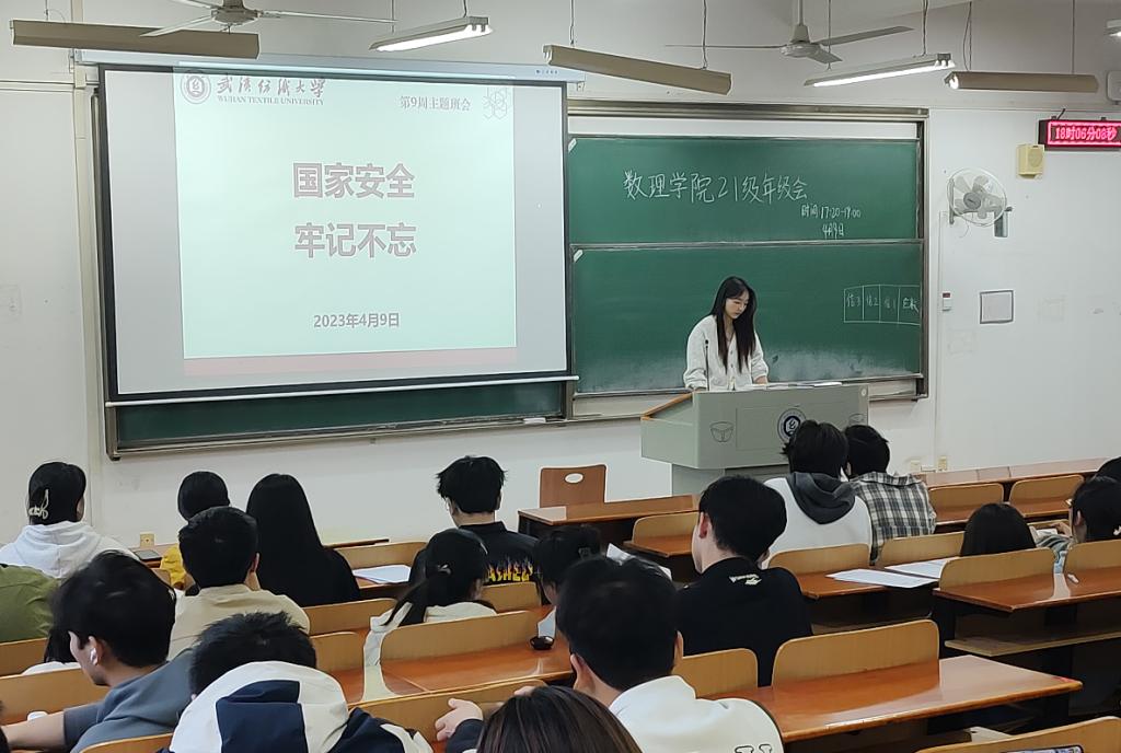 本次班会围绕国家安全教育展开,着重向同学们介绍国家安全教育的重要性及维护国家安全的做法,通过播放国家安全教育纪录片、分析解读反面案例,让同学们了解到侵害国家安全的行为所带来的恶劣影响,引导大家牢固树立“从身边做起从小事做起,共同守护国家安全”的意识。除此之外,各班带领学生学习、辨识、防范新冠疫苗诈骗和音乐会诈骗等新型诈骗手段,组织全体学生签订《武汉纺织大学防范电信网络诈骗告知书》及《承诺书》。最后,各年级辅导员向大家宣讲《关于开展2023年兵役登记工作的通知》,结合解读《中华人民共和国兵役法》,引导学生认识到进行兵役登记的法定义务,鼓励大家响应国家号召,献身国防,投身军营,用青春书写军旅人生。