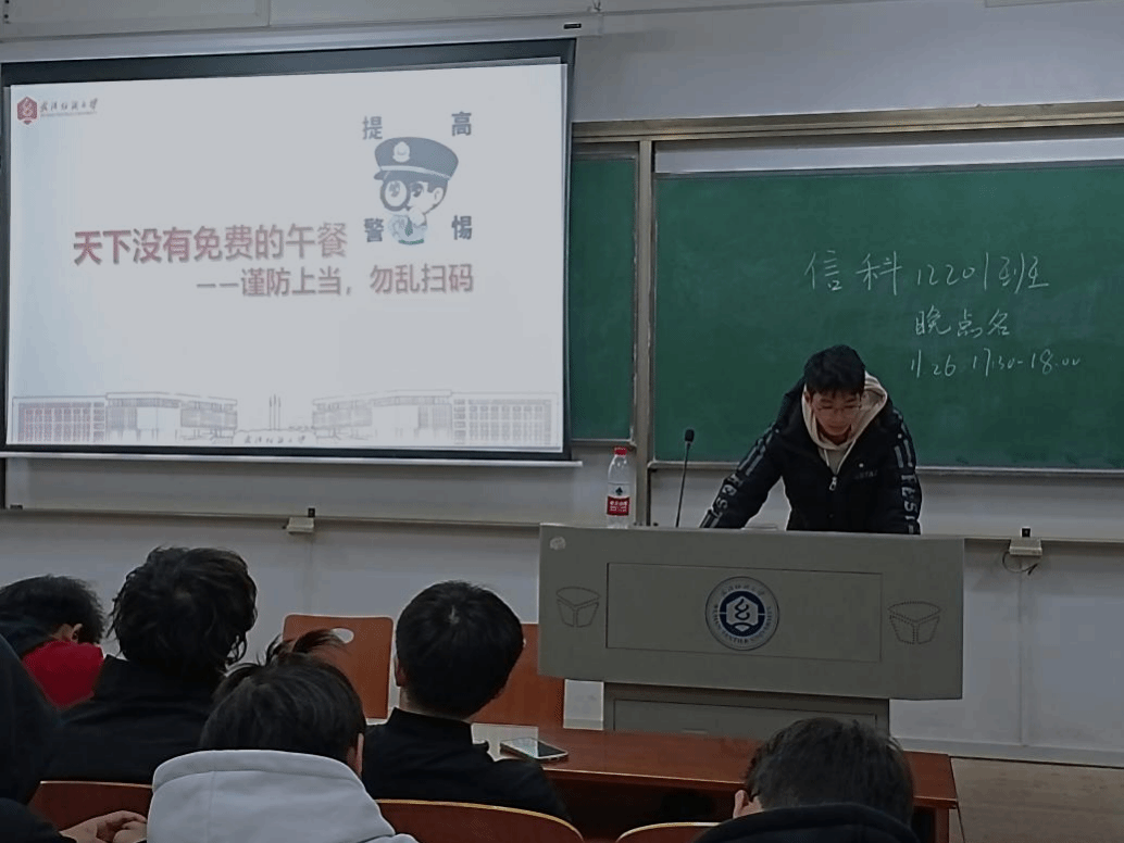 团支书围绕“防诈骗”安全教育方面进行了交流,指出“天下没有免费的午餐”这一道理。提醒同学们学会识别那些看似“免费”的陷阱和诱惑,避免因此而损失惨重。