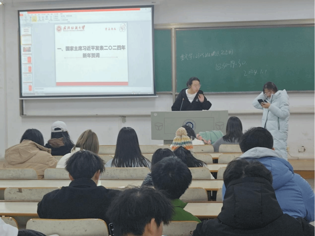 班会伊始,我们一起学习了习近平主席发表的二〇二四年新年贺词和武汉纺织大学2024年新年贺词。“C919大飞机实现商飞,国产大型邮轮完成试航,神舟家族太空接力,“奋斗者”号极限深潜”,过去的2023,国家加快构建新发展格局,推动高质量发展;“生物工程与健康韦德bet
