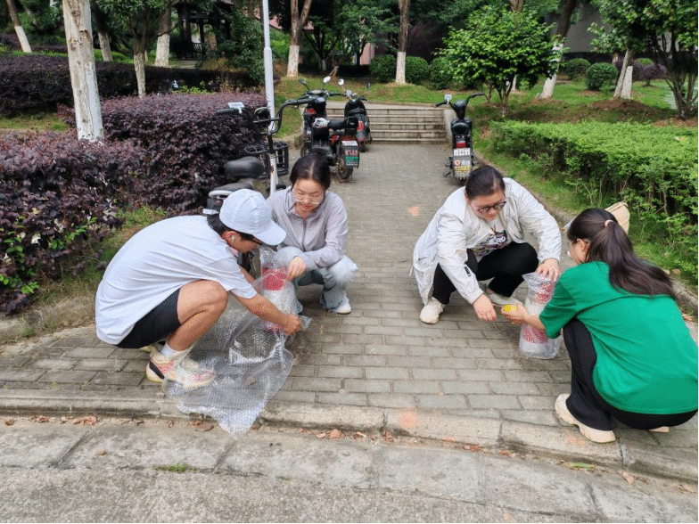 组织入党积极分子开展“守护同学骑行安全”志愿服务活动,对阳光校区内对非机动车道上的隔离桩进行防撞包裹。