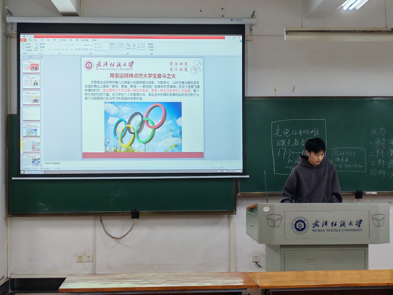班会伊始,班长从起源、内涵、时代价值解读奥林匹克精神。其源于古希腊,现是全人类精神财富;核心是 “更快、更高、更强 —— 更团结”,“更团结” 凸显全球化下的凝聚力量。结合奥运案例,让同学们明白运动不仅是体能较量,更是意志与道德的展现,且能促进交流、培养坚韧品质,契合新时代青年成长需求。