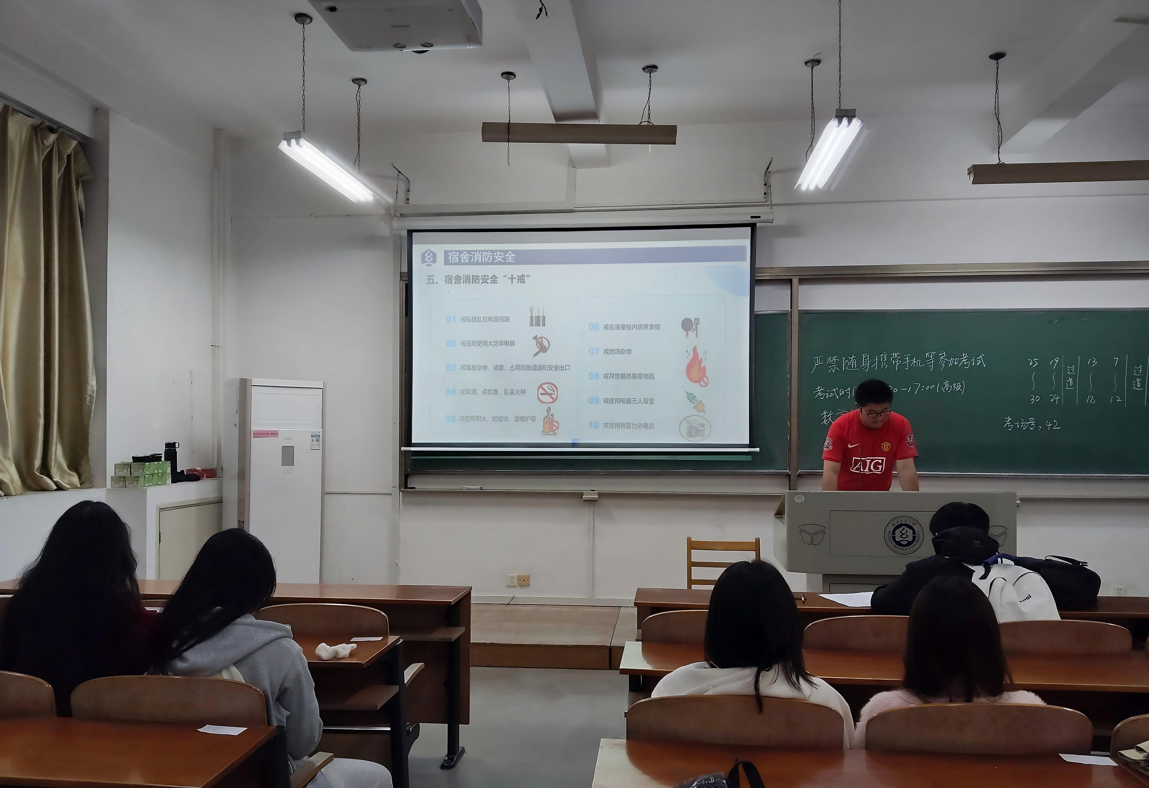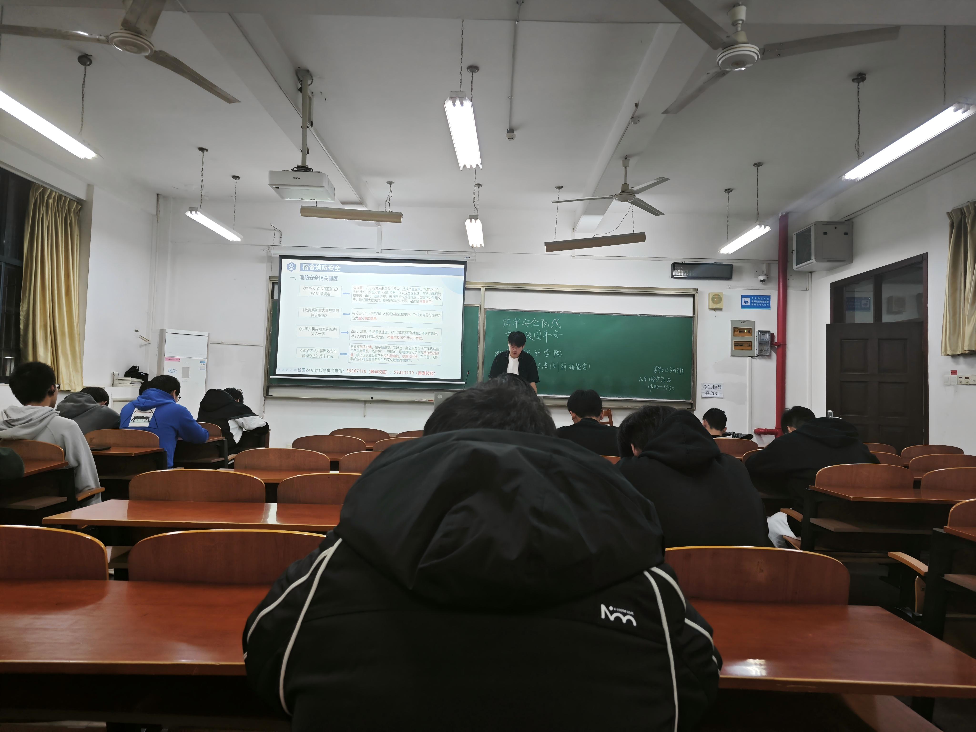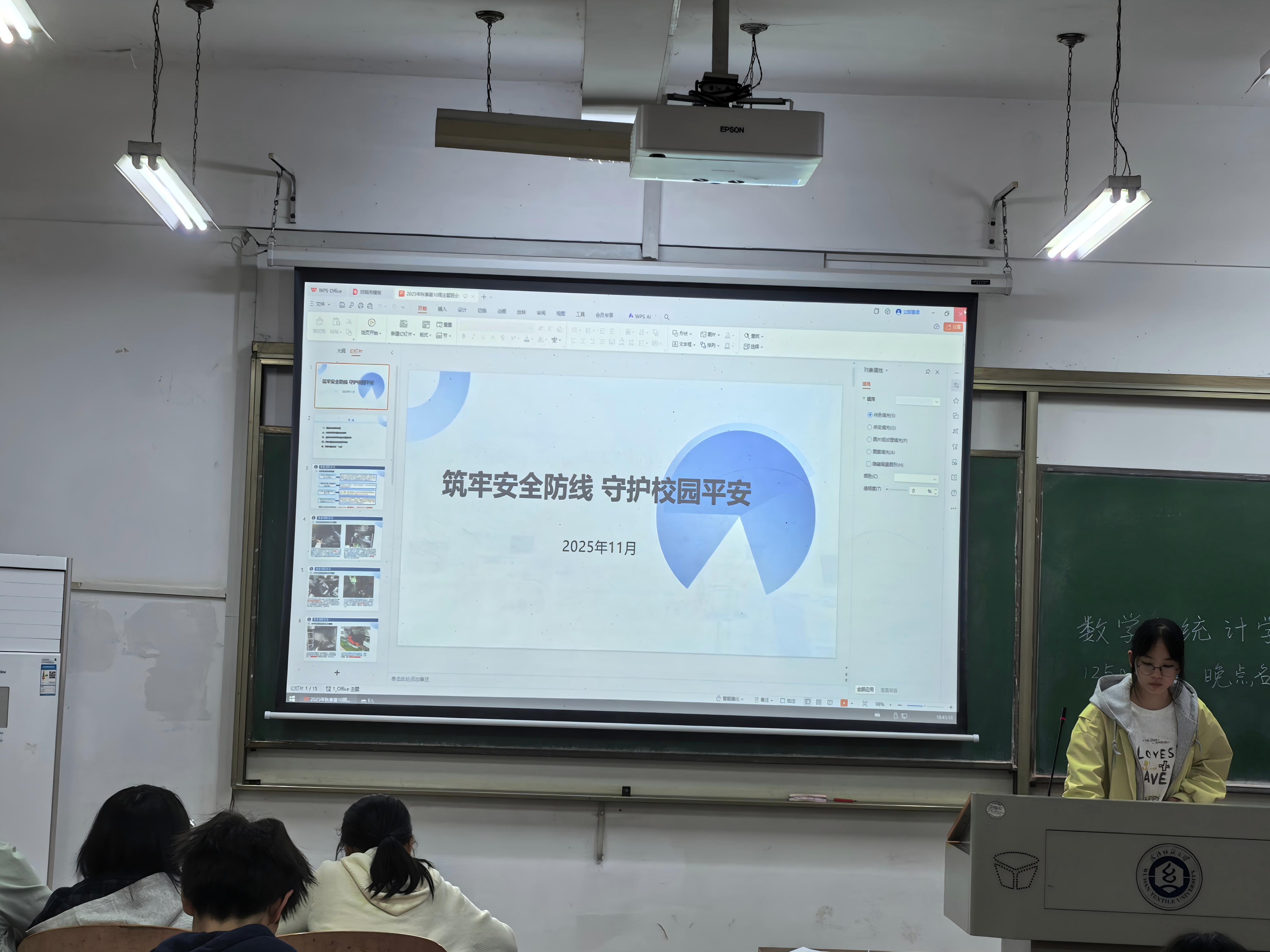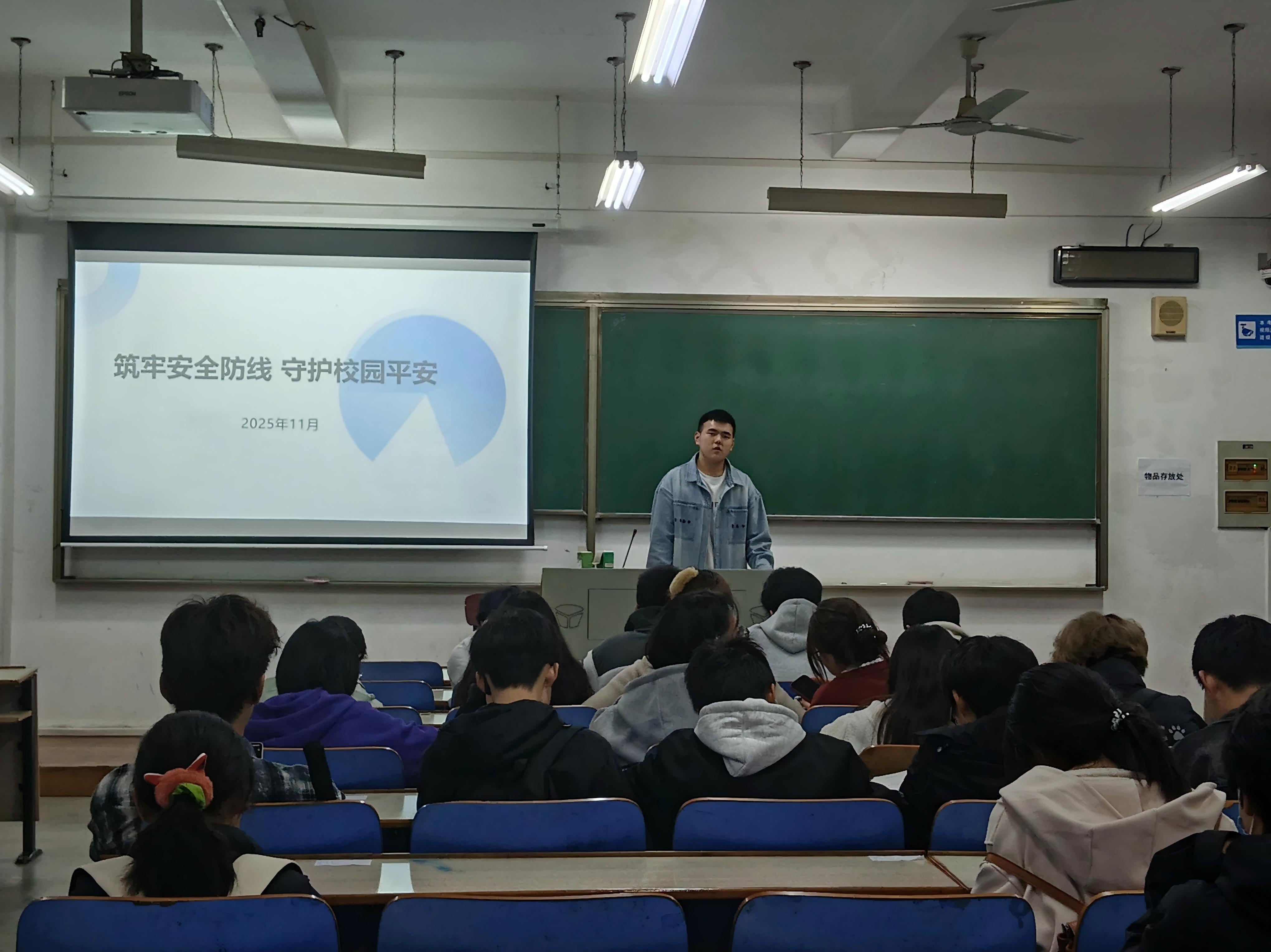 于2025年11月在崇志楼开展了以"筑牢安全防线 守护校园平安"为主题的安全教育班会。此次班会全体同学参加,班会由各班班长主持。