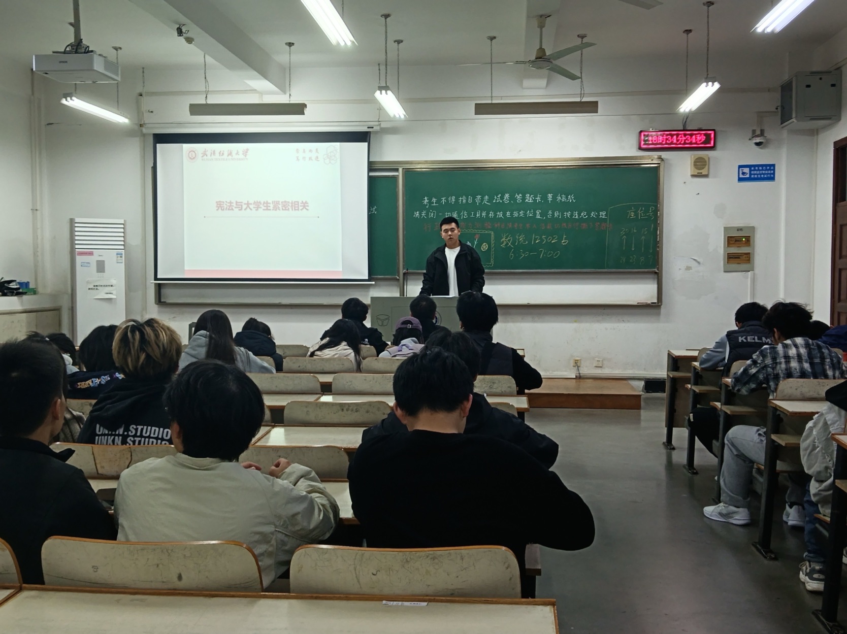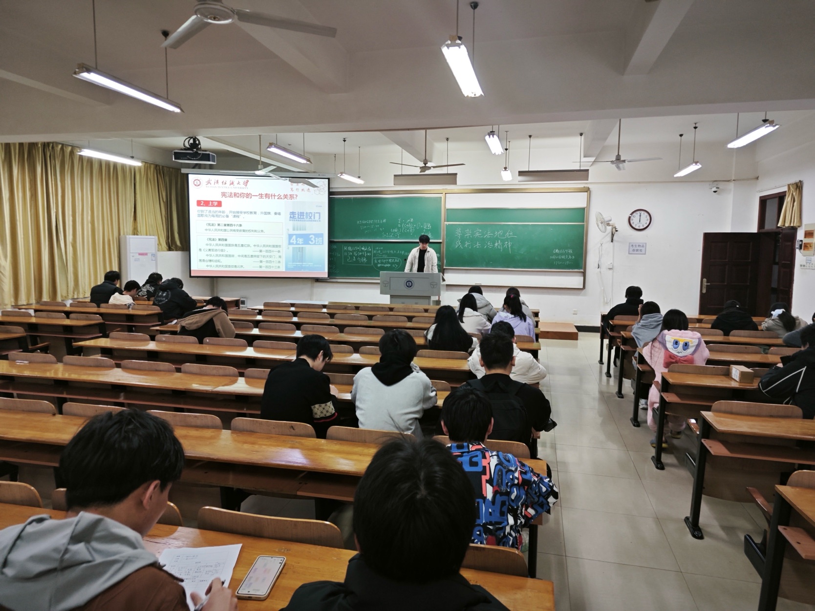 随后,班会重点讲解宪法基本知识。主持人详细介绍了宪法的定义、地位、基本原则与核心精神,明确现行宪法是 1982 年通过并历经五次修改的第四部宪法,其内容涵盖国家基本制度、公民基本权利与义务、国家机构等重要方面。通过案例解读,同学们了解到宪法与日常生活的紧密联系 —— 从出生时的权利保障、上学时的受教育权,到成年后的选举权、工作后的劳动权与休息权,再到婚姻家庭保护、退休后的生活保障,宪法的守护贯穿人生全程。针对大学生群体,主持人特别强调了平等权、宗教信仰自由、人身自由、监督权等宪法赋予的基本权利以及维护国家统一、遵守宪法法律、保卫祖国等公民应尽的基本义务。