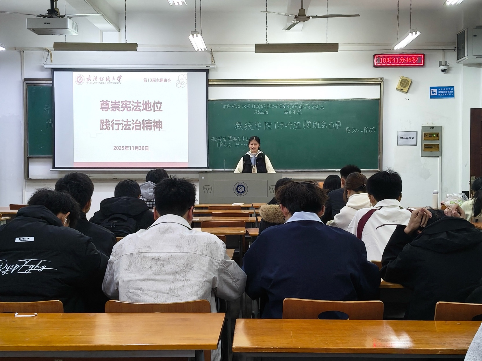 各班级开展以 “尊崇宪法地位,践行法治精神” 为主题的第十三周班会。本次班会由各班班长主持,全体同学参加。