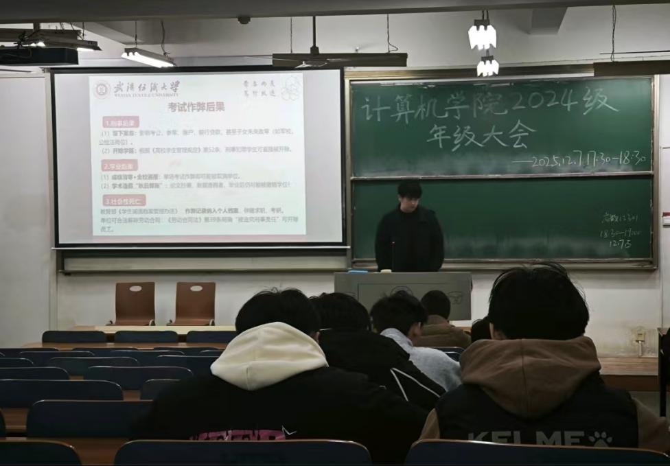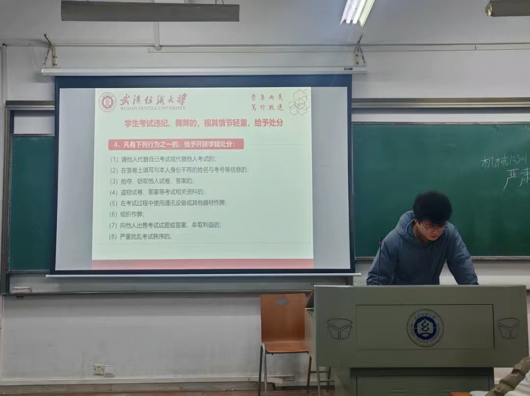 在诚信应考警示教育环节,班会重点解读了考试作弊的法律红线与学业后果。班主任结合《中华人民共和国教育法》相关规定,详细讲解了组织考试作弊罪、代替考试罪、非法出售试题答案罪等具体罪名的量刑标准,明确作弊不仅会面临刑事处罚、留下终身案底,还会影响考公、参军等未来发展;同时对照《武汉纺织大学学生考试违纪处理办法(修订)》,逐条梳理了从警告到开除学籍的不同违纪舞弊行为。