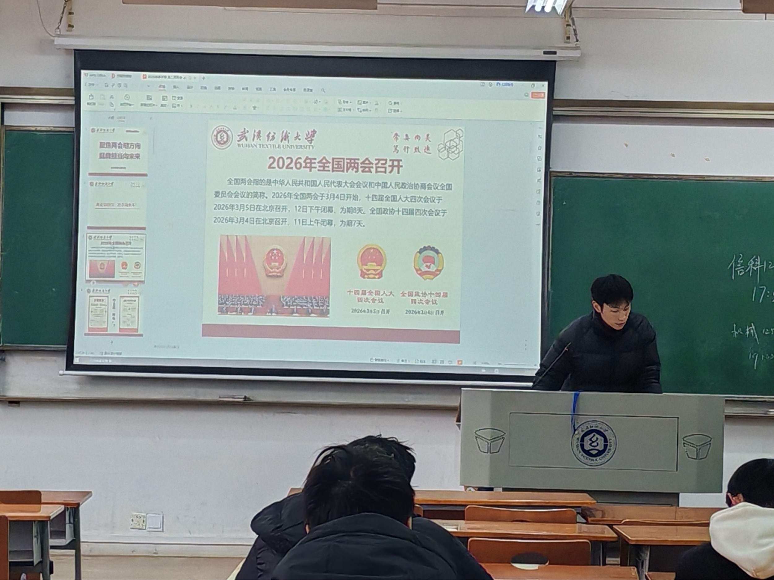 于3月8号在各班教室开展了以“从五大‘关键词’看2026年全国两会热点”为主题的班会活动。班会由各班班长主持,全体同学参与学习。
