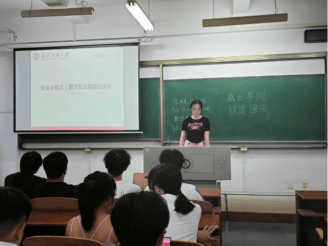 随后,团支书也向同学们送达国庆的安全指南,从五个方面告知同学们如何保证在假期度过安全且充实的时光。无论在学校外还是学校内应防患于未然,注意用电谨防火灾发生、保持判别能力严防偷抢骗、假期出游注意人身安全、远离聚集地防踩踏事件、文明上网保护绿色环境。