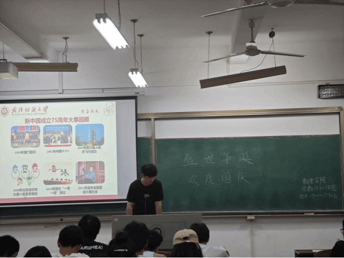 会议伊始,团支书介绍了“盛世华诞 欢度国庆”的班会主题。主要包含“庆祝新中国成立75周年”和“国庆安全指南”两个方面