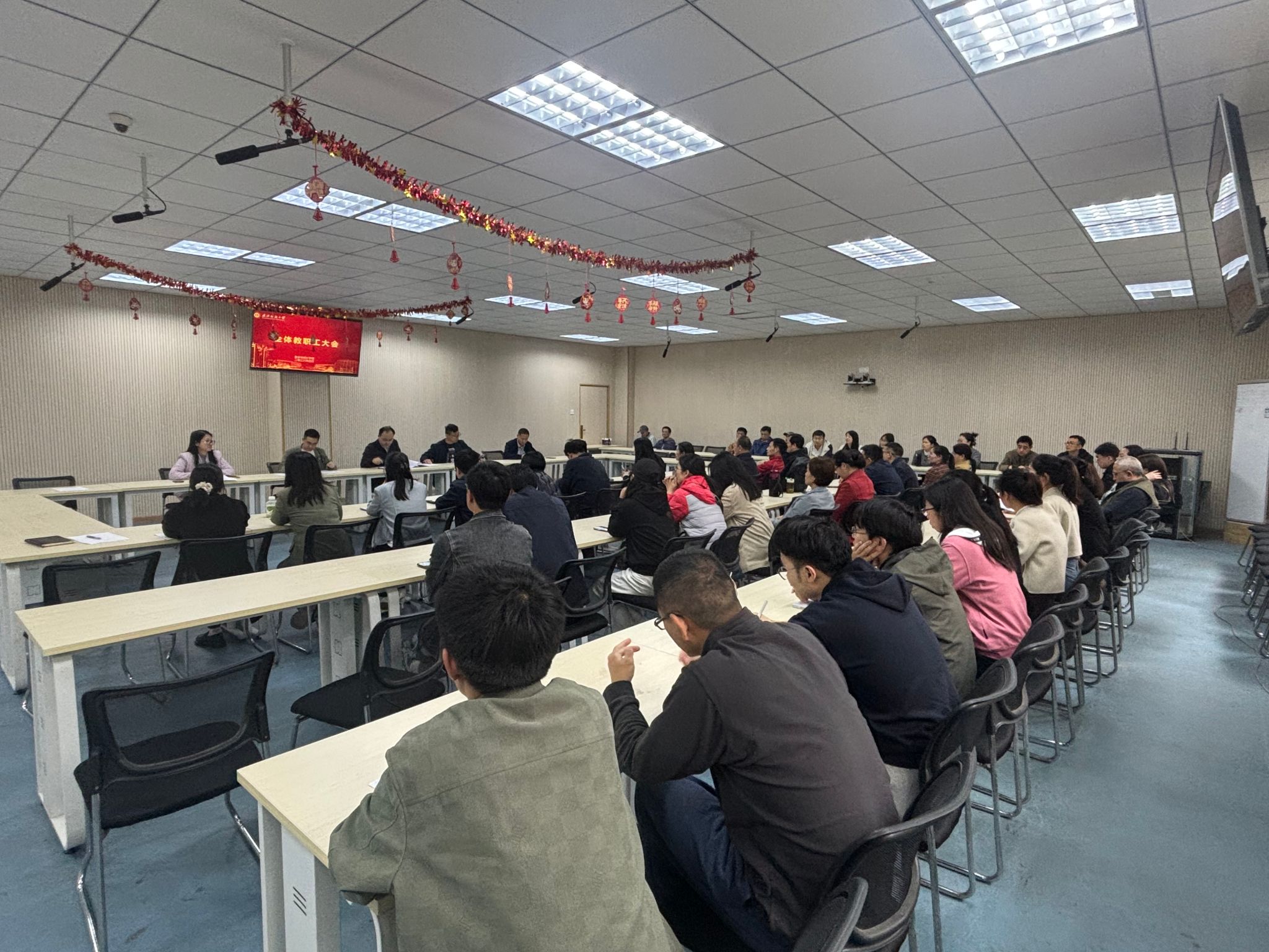 全体教职工大会在崇文楼205会议室召开。学校党委常委、党委组织部部长段丁强出席并讲话,组织部副部长余志稳主持。