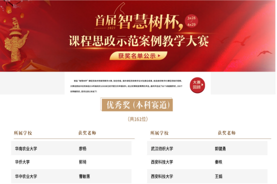 首届“智慧树”杯课程思政示范案例教学大赛旨在深入贯彻习近平总书记关于教育的重要论述和全国教育大会精神,贯彻落实教育部《高等学校课程思政建设指导纲要》,挖掘、展示在线课程及混合式课程的课程思政教学设计及建设成果,共吸引了来自全国354所高校1000余位老师的参赛。大赛由东西部高校课程共享联盟运营服务单位智慧树主办,从2021年3月28日开始,经过初赛和复赛,经组委会及专家评审,最终评选出260个获奖案例。