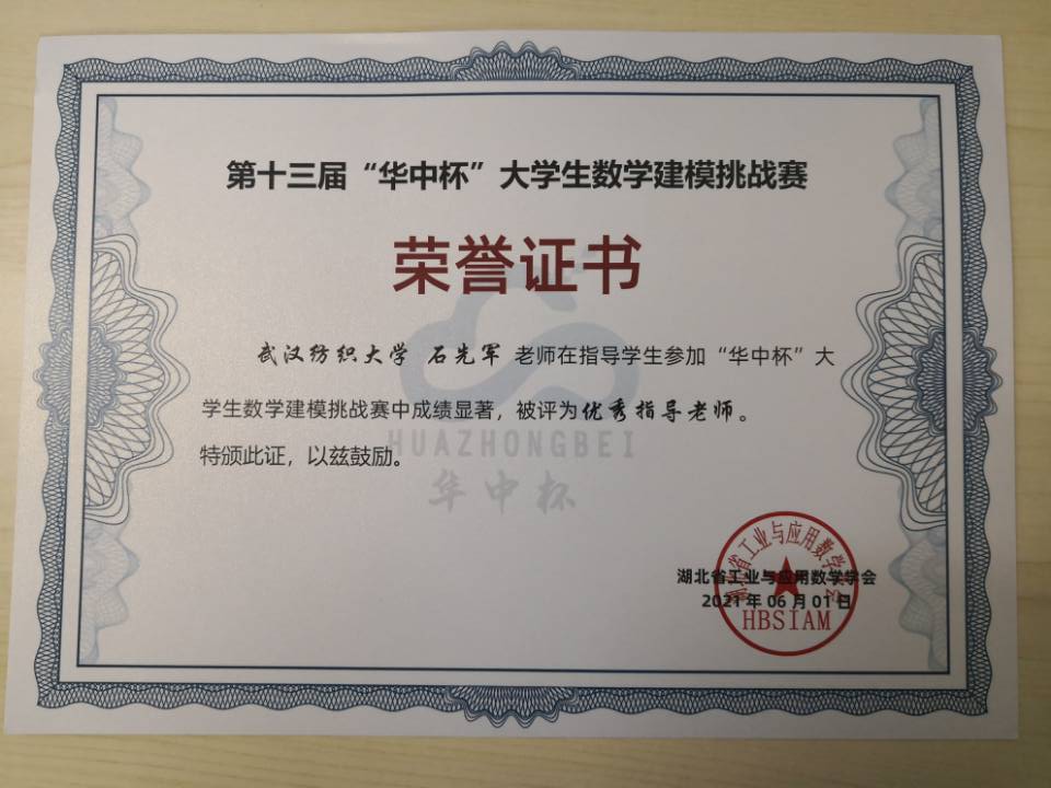 取得初步成效,师生相得益彰。有耕耘必有收获!在不久前结束的第十三届全国大学生大学数学竞赛上,学校有300多名学生参赛,获得85项省级奖项,现正在积极参加全国决赛;毛耀老师被中国数学学会评为大学数学优秀指导老师。在全国大学生数学建模大赛上,纺大学子斩获4项省赛二等奖1项,三等奖3项),石先军老师被评为优秀指导老师;在美国大学生数学建模大赛,纺大学子斩获二等奖3项、三等奖18项,郑仟老师被评为优秀指导老师。相信不久的将来,越来越多的纺大学子会在数学素养提升中绽放青春芳华,越来越多的教师会收获更大的荣光!