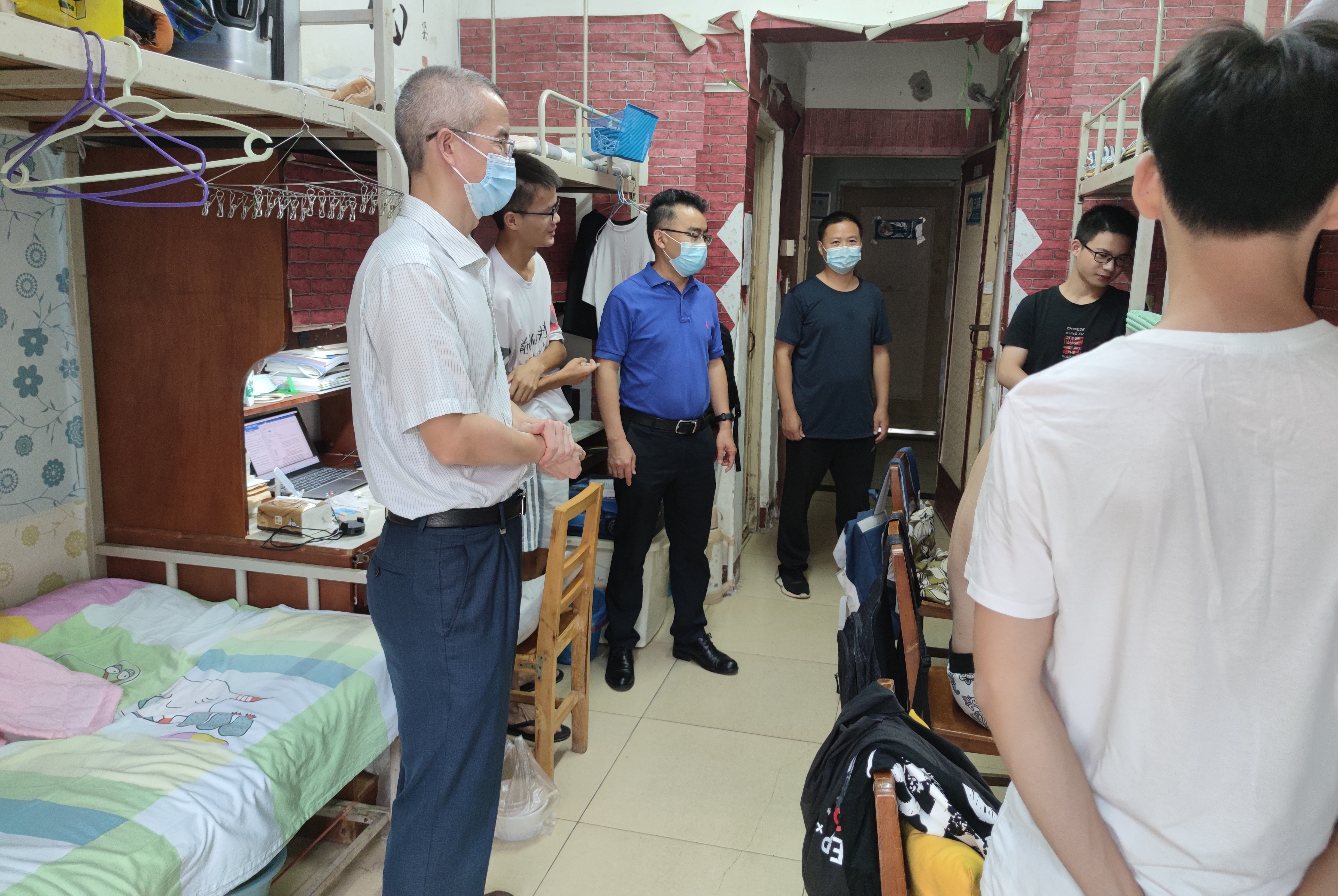 党委书记段溢波、院长汪胜祥、副书记陈国鹏及辅导员走访了学生宿舍,看望慰问返校学生。