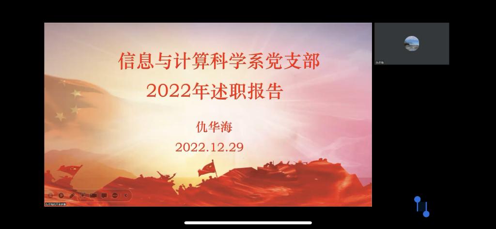 信科系党支部、应数系党支部、大数中心党支部、大学物理党支部、行政党支部、学生党支部等6位支部书记分别从全面学习贯彻落实习近平新时代中国特色社会主义思想和党的二十大精神,教育党员、管理党员、监督党员、组织师生、宣传师生、凝聚师生、服务师生、疫情防控等方面进行了总结报告。