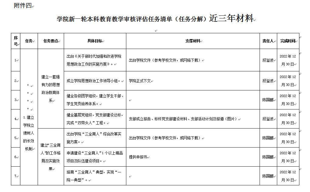 新一轮本科教育教学审核评估任务表”,汇报了各系(中心)前一阶段的审核评估准备工作进度。