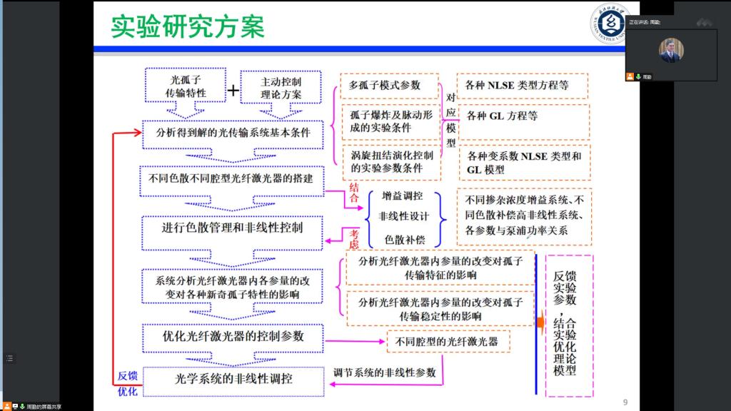 校长徐卫林院士围绕团队建设、科研方向、国家需求、国际合作等方面对团队提出了殷切期望。一要加强团队建设。既要从严要求团队成员,甘于寂寞、坚持不懈,又要想方设法帮助团队成员,充分发挥科研人员的能动性、积极性;既要激活物理学科现有师资存量,又要适度扩大物理学科高水平人才引进的增量;既要注重基础理论研究,也要积极指导大学生参加学科竞赛。二要凝练研究方向。紧紧抓住湖北省新一轮一流学科建设的契机,围绕学校ESI学科前1%的目标,不断强化物理学科建设,从宽泛的物理学科领域找到一个突破点,并以此为基础与学校优势特色学科相结合,助力学校实现一流学科重点建设学科的建设目标。三要面向国家需求。紧紧抓住国家重大战略全局、科技体制改革的变局和国家对武汉光电产业的布局,以非线性光科学与技术研究团队的光孤子研究为立足点,提升研究能力和水平,彰显研究特色,辐射光电领域,助力学校在武汉光电产业布局中有一席之地。四要注重国际合作。在非线性光科学与技术研究团队的已有国际合作研究项目的基础上,进一步挖掘科研潜力,坚持在开放的大环境中加强国际交流合作,尤其是加强与“一带一路”国家的国际研究合作,在吸收人类共有的先进技术成果的同时为世界科技发展贡献纺大力量,发出纺大声音,彰显纺大特色。