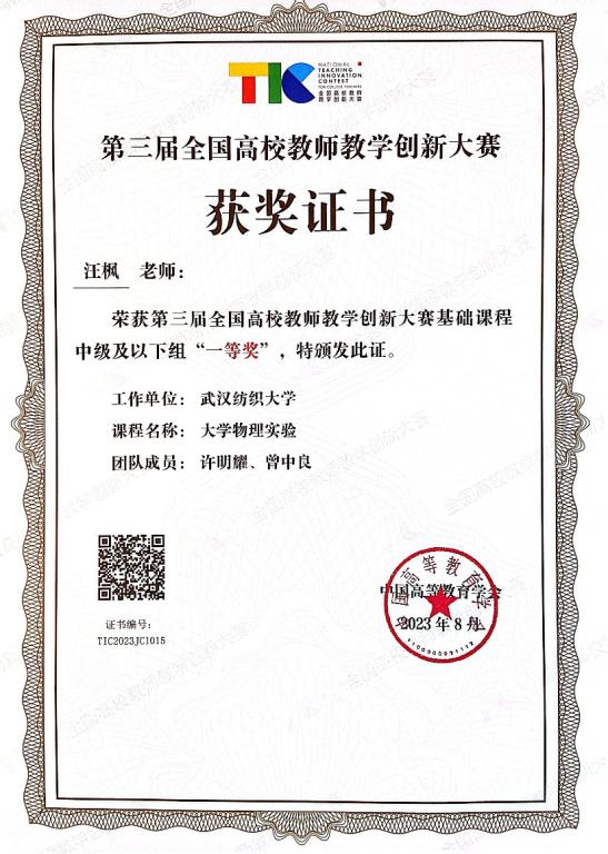 汪枫老师在本次大赛中荣获一等奖(基础课程中级及以下组),创我校参赛以来最佳成绩,实现了全国一等奖突破。