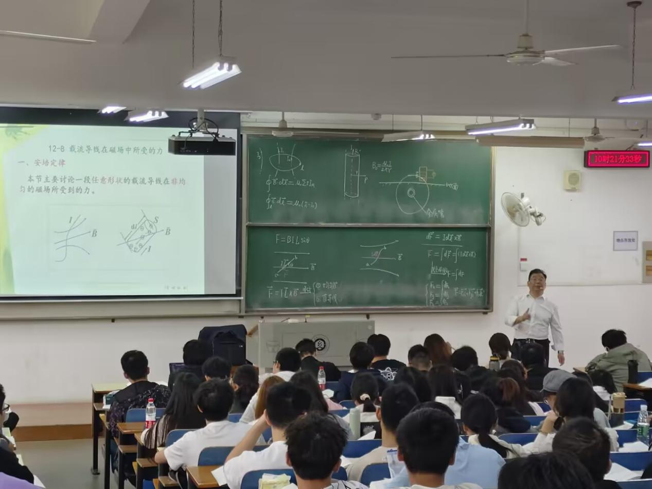 陈老师讲授的课程是《大学物理BⅡ》,他运用图文并茂、辅助动画演示的多媒体课件,并结合黑板板书,声情并茂讲解了“安培定律和磁场对载流线圈的作用”。在课堂教学中,陈老师讲课思路清晰,肢体语言丰富,课堂气氛活跃,授课极富感染力,受到师生一致好评。