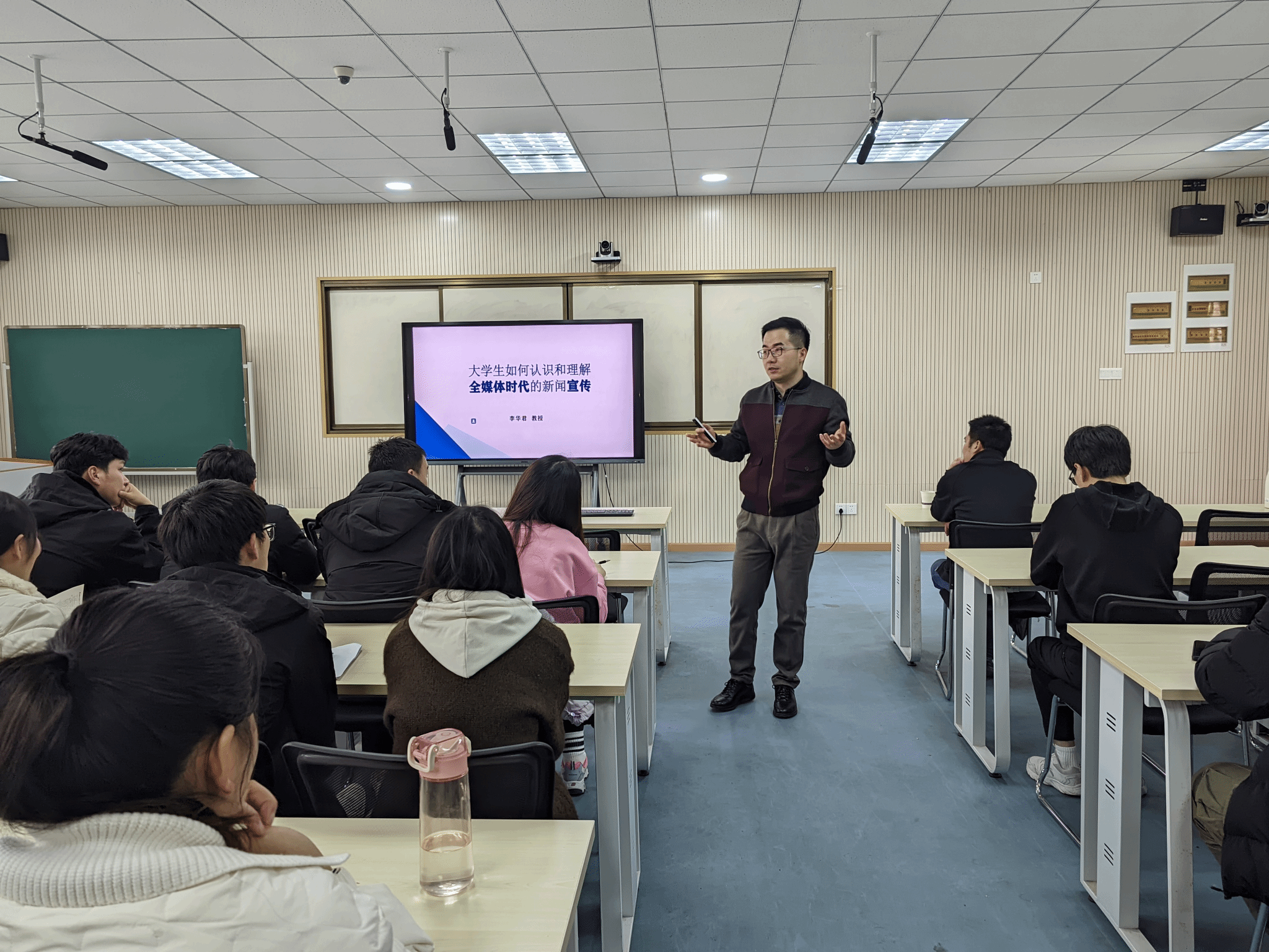李华君围绕“大学生如何认识和理解全媒体时代的新闻宣传”的主题,从当前流行、大学生关心的网络热词“身材管理”、“爱自己”等话题切入,通过“全媒体时代为什么要坚持正面新闻宣传”,“全媒体时代新闻宣传可能面临的挑战”,“全媒体时代做好新闻宣传的未来路径”等三个方面,为大家带来了一场研讨式思想盛宴。