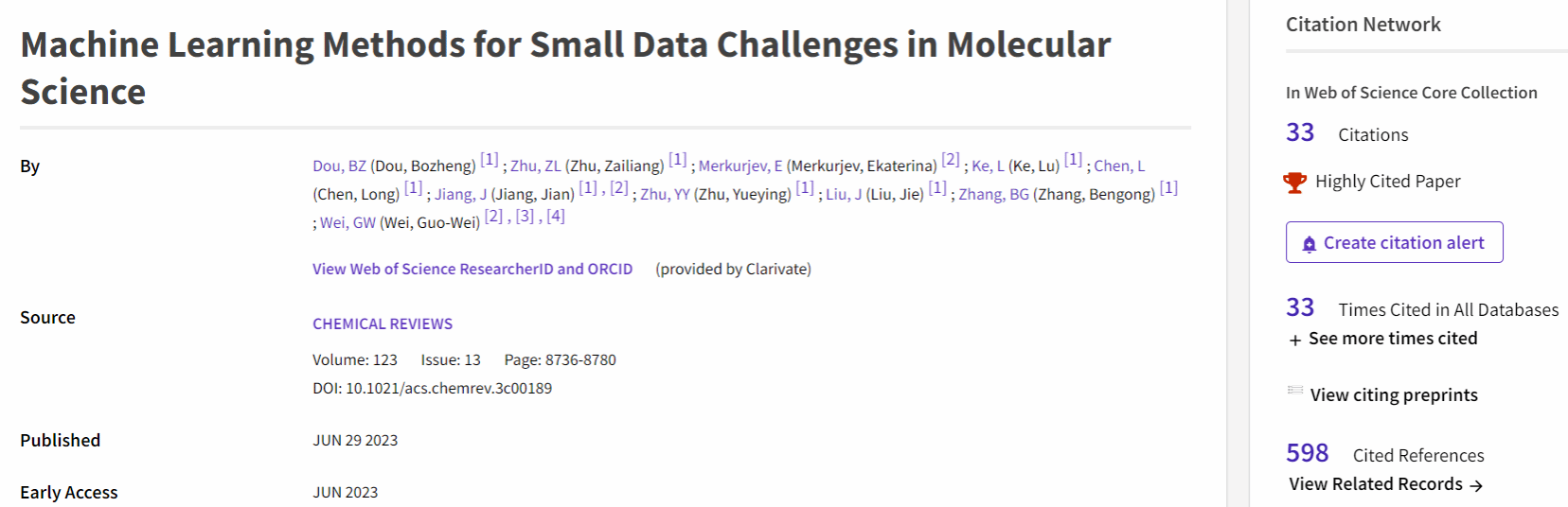 江健教授为第一通讯作者,其研究生窦博正为第一作者并以我校为第一单位在化学领域顶级期刊《Chemical Reviews》(影响因子62.1)上发表的论文“Machine Learning Methods for Small Data Challenges in Molecular Science”(Chem. Rev. 2023, 123, 8736−8780)成功入选化学学科领域全球前1%ESI高被引论文。该论文也是我校历史上影响因子最高的期刊论文。