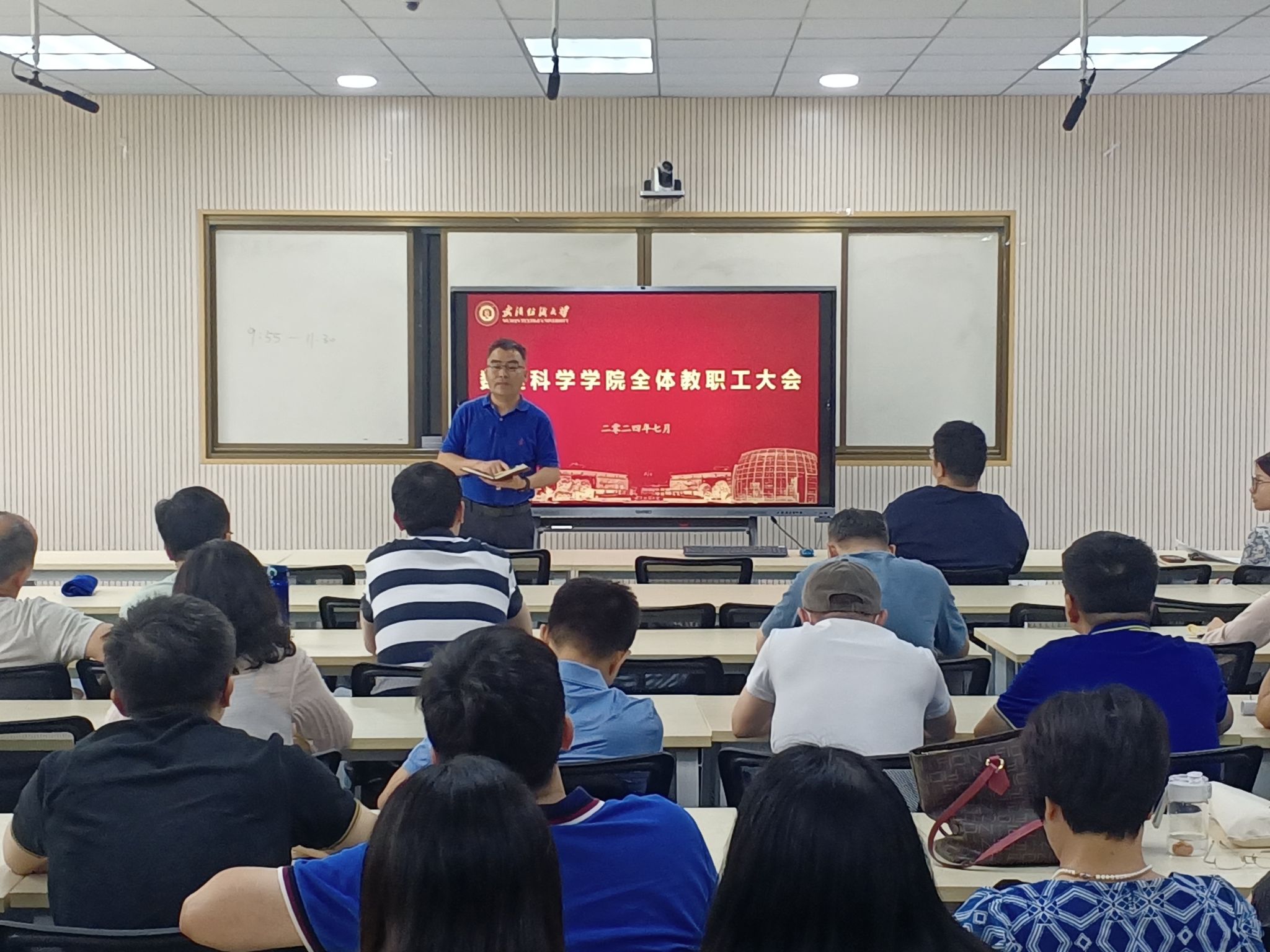 工作以及布置新学期的重点工作。会议由党委书记段溢波主持,全体教职工与会。