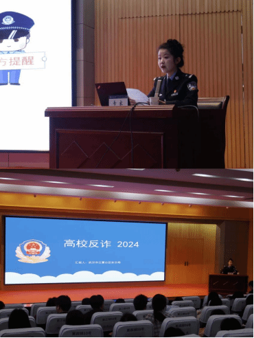 毛警长以《高校反诈2024》为主题,向同学们现场演绎了刷单返利、冒充熟人诈骗、网购客服诈骗、游戏交易诈骗等常见套路与话术,分享了识别与预防技巧。她特别强调了刷单、交友这两大大学生群体中常见的陷阱,警醒同学们保持警惕,切勿轻信天降“美事”,并提醒注意出借银行卡等触及法律红线的“随意”行为,告诫学生不可因贪图微小利益而误入歧途。她语重心长地叮嘱大家远离毒品,尤其带有伪装的新型毒品。专家言辞恳切,同学们全神贯注,听得津津有味。