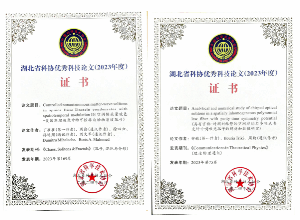 2024年9月24日,由湖北省科协主办,以“新领域、新赛道─服务支撑新质生产力”为主题的2024年湖北科学技术学术年会开幕式暨主论坛在武汉举办,会上发布了2023年度湖北省科协优秀科技论文名单。武汉纺织大学非线性光科学与技术研究团队两项研究成果由湖北省孤立子研究会推荐,经材料审查、专家评审、省科协党组审定,成功入选。