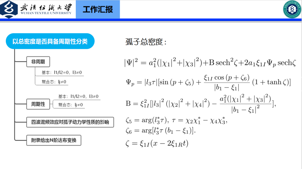 吴森:本次组会对近期工作内容进行了总结汇报,以Manakov系统的背景介绍进行展开,展示了Manakov系统的三种矢量孤子解,引出了我们正在做的跳动孤子。我们的工作是研究具有四波混频项的非线性薛定谔方程,通过变换转化为Manakov方程,利用该方程的亮暗孤子叠加得到原方程的跳动孤子。我们指出四波混频参数会使系统的总密度呈现出周期性,会影响系统的对称性,会使得孤子的振幅发生变化,并给出了相应的相图标注了各个分区导致的不同动力学现象。