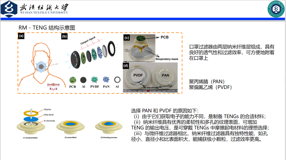 高成:本次组会汇报了智能纳米纤维口罩及其呼吸监测的研究进展。通过摩擦纳米发电机(TENG)和表面增强拉曼散射(SERS)的结合,研究了静电纺丝制备的纳米纤维厚度与粗糙度对TENG性能的影响以及掺杂不同形貌的银对SERS性能的影响。研究发现,在聚丙烯腈—聚偏氟乙烯(PAN-PVDF)结构下,摩擦电电压随表面粗糙度和电极层和导电层的表面之间的差距距离的减小而增加;在拉曼激光的照射下,纤维素中掺杂的银可以大大增强目标分子的拉曼信号。相比于商业口罩,实现了智能口罩的自供电和低浓度的目标分子拉曼检测,使在手机上实时远程监控使用者的呼吸频率等物理指标和携带的病毒等生化指标成为可能。