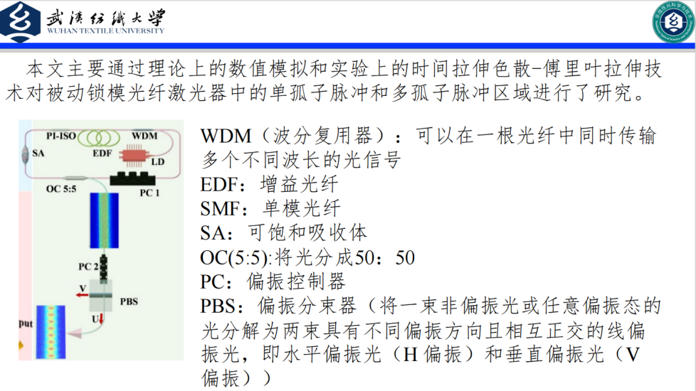 俞可欣:本研究聚焦于被动锁模光纤激光器中单孤子与多孤子脉冲的动态特性及其编码信息存储潜力。通过结合数值模拟与实验验证,旨在揭示孤子脉冲的形成机制、偏振演化规律及非线性效应的影响,为光纤通信与高精度激光器设计提供理论支持。数值模拟方法分步傅里叶法:用于线性项(色散、双折射)的频域求解。四阶龙格库塔法:用于非线性项(自相位调制、交叉相位调制)的时域迭代。光路循环模拟:5000圈循环模拟脉冲演化,对比实验与仿真结果。耦合非线性方程能准确描述光纤中孤子脉冲的动态演化。实验与仿真结合的方法为复杂光路设计提供了高效验证工具。