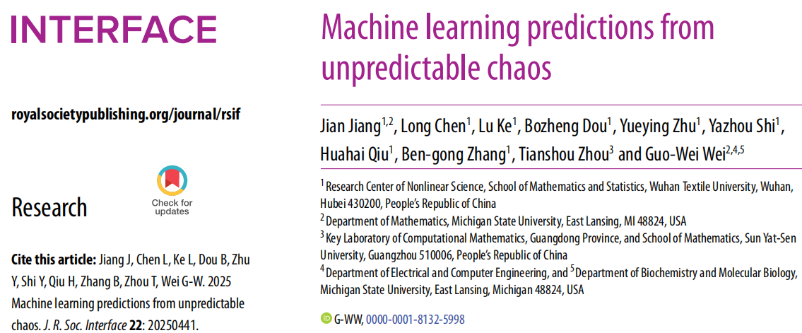 江健教授团队在药物设计方面取得重要研究进展。相关成果以“Machine learning predictions from unpredictable chaos”在物理科学与生命科学的交叉领域顶级期刊《Journal of the Royal Society Interface》上发表(J. R. Soc. Interface 22: 20250441, 2025,文章链接//doi.org/10.1098/rsif.2025.0441)。江健为第一作者,武汉纺织大学为第一单位。该工作与美国密歇根州立大学Guo-wei Wei教授团队共同完成。