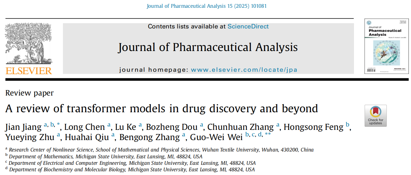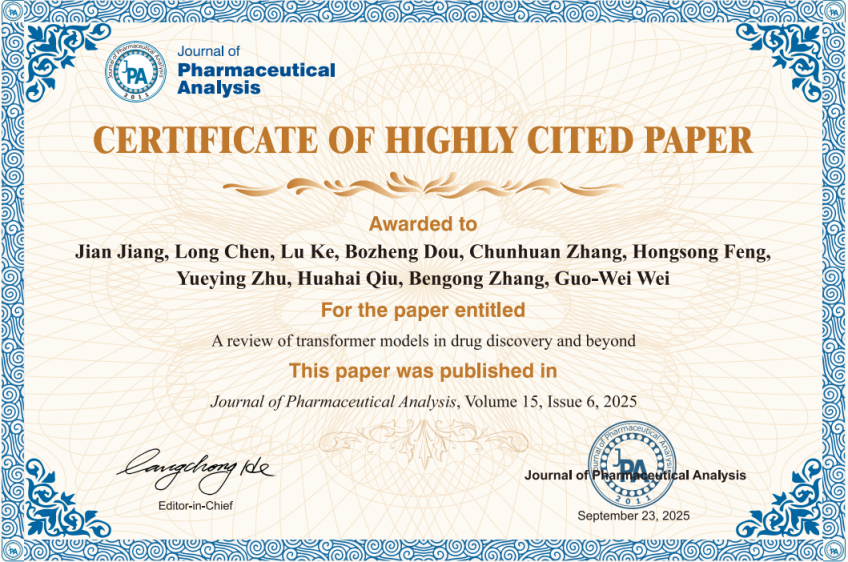 江健教授团队2025年6月发表在国际学术顶级期刊《Journal of Pharmaceutical Analysis》(中科院一区Top)的学术论文“A review of transformer models in drug discovery and beyond”(J. Pharm. Anal. 15, 6, 101081, 2025,文章链接//doi.org/10.1016/j.jpha.2024.101081)成功入选药理学与毒理学领域ESI全球前0.1%热点论文。论文第一作者为江健教授,美国密歇根州立大学Guo-Wei Wei教授为通讯作者,武汉纺织大学为第一通讯单位。