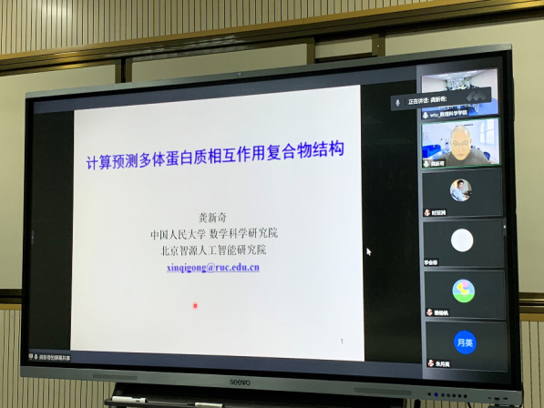 206教研室成功举办。本次活动邀请中国人民大学数学科学研究院龚新奇教授做题为“计算预测多体蛋白质相互作用复合物结构”的线上报告。本次活动由数学与应用数学系主任江健教授主持,副院长郑仟副教授,数学专业的相关老师以及全体研究生同学参加了本次研讨活动。