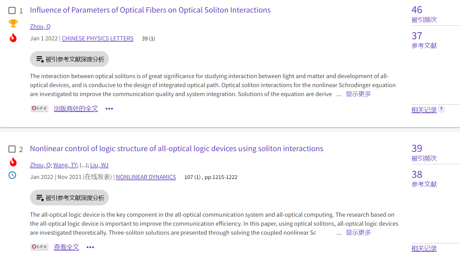 当多个孤子同时在光纤通信系统中进行传输时,孤子间会发生相互作用,从而影响通信传输质量。团队基于双线性法获得的精确双孤子和三孤子,详细分析了光纤参量对孤子碰撞的影响,提出了对孤子间相互作用强度进行有效调控的方法。上述成果以题为“Nonlinear control of logic structure of all-optical logic devices using soliton interactions”和“Influence of parameters of optical fibers on optical soliton interactions”发表在《Nonlinear Dynamics》和国内卓越期刊《Chinese Physics Letters》,分别入选为工程和物理学科ESI热点论文。