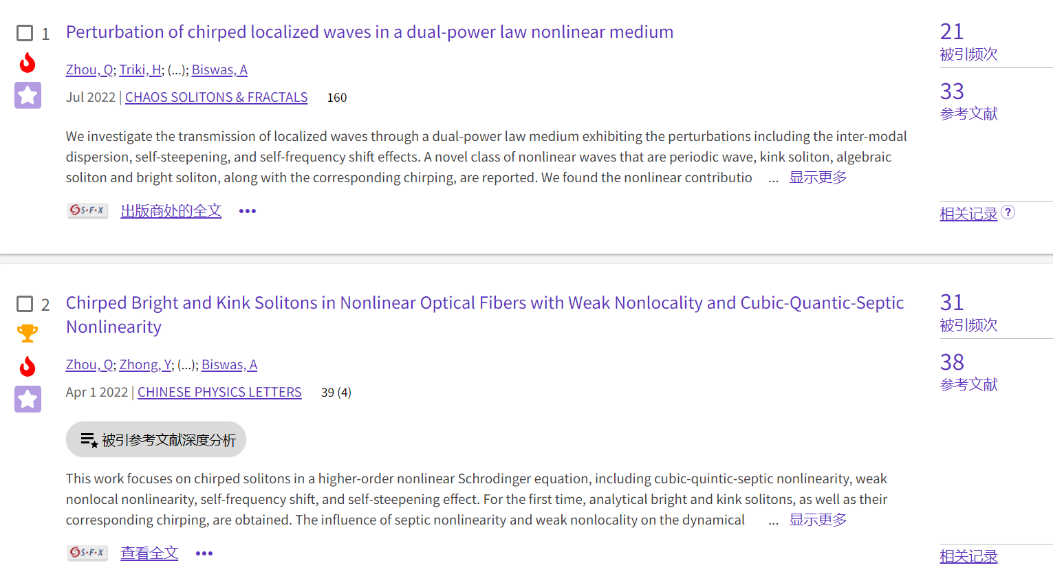 高非线性介质中局域波的传输特性是非线性科学领域的研究热点。团队分别报道了“三次-五次-七次”非线性光纤、双幂类非线性介质中存在的精确啁啾孤子,揭示了自频移效应和自陡峭效应是引起非线性啁啾的原因,提出了利用非线性效应对孤子脉冲进行压缩的技术方案。上述成果均进入物理学领域最优秀的1‰之列,入选ESI热点论文,其中论文Chaos, Solitons & Fractals 2022;160:112198以数理科学韦德bet