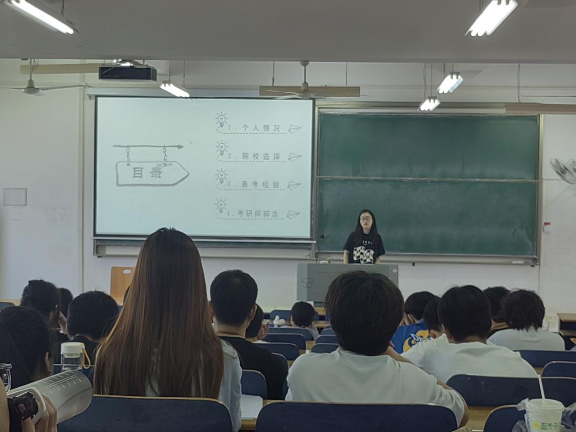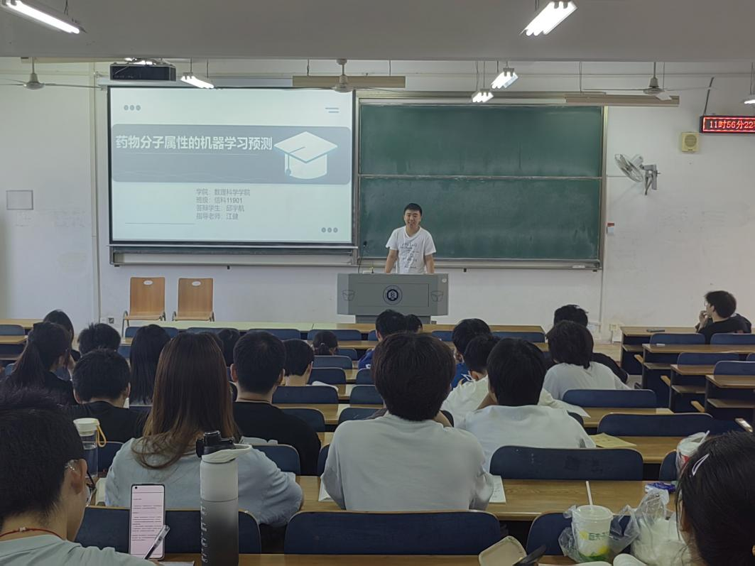 毛耀老师介绍数学竞赛的重要意义并鼓励同学们积极参加。吴仔航、邱宇航学长讲解分享优秀毕业设计《武汉纺织大学二手市场小程序的设计与实现》、《药物机械分子的机器学习预测》。他们都提到,只有多参加学术竞赛活动来拓宽自己的视野,才能更好地学习数学、提高能力。罗淑杰学姐真诚分享考研心得和体会,以及如何充分备战考研。周钰学长向同学们分享他在纺大参与数学竞赛的历程以及学习数学的学习方法和数学书籍推荐。周钰学长强调:学习数学最重要的是学习方法,其一是学会“追根溯源”,即深入了解数学知识背后的原理和推导过程,不仅仅是记住公式、方法和结论,而是要理解其由来和推演过程,以此建立数学知识的系统性和连贯性;其二是不要追求只“看懂”书上的过程,而是要注重理解和掌握数学知识的思维方法和本质,而不是仅仅记住一些例子和步骤;其三是可适当掌握“高屋建瓴”的思想,也就是应该从整体出发,理解知识点的背景和原理,掌握不同知识点之间的逻辑关系,做到全面深入地掌握数学知识,从而建立起完整的数学框架。