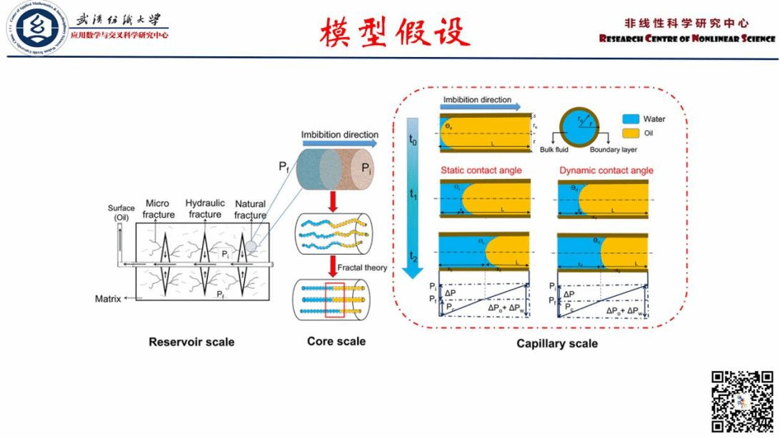 谢磊:汇报关于建立致密多孔介质动态渗吸(DI)过程的分形模型。将动态接触角(DCA)耦合到毛细管和岩心尺度的动态接触角模型中,建立了该模型并提出了一种数值求解方法。然后,根据文献中报道的实验数据验证了该模型,并对模型中的各项参数进行了敏感性分析。结果表明,该模型与实验数据拟合较好。